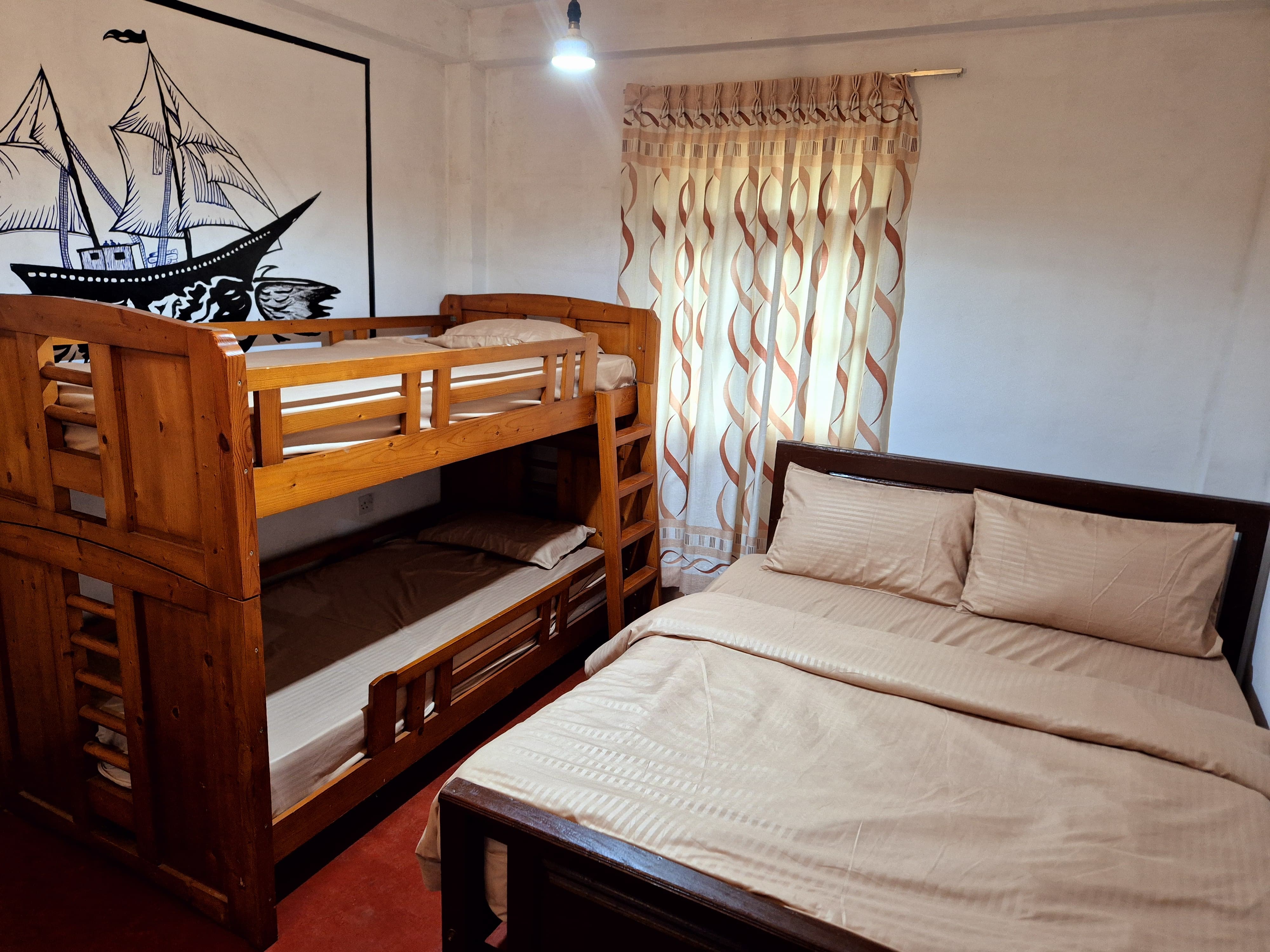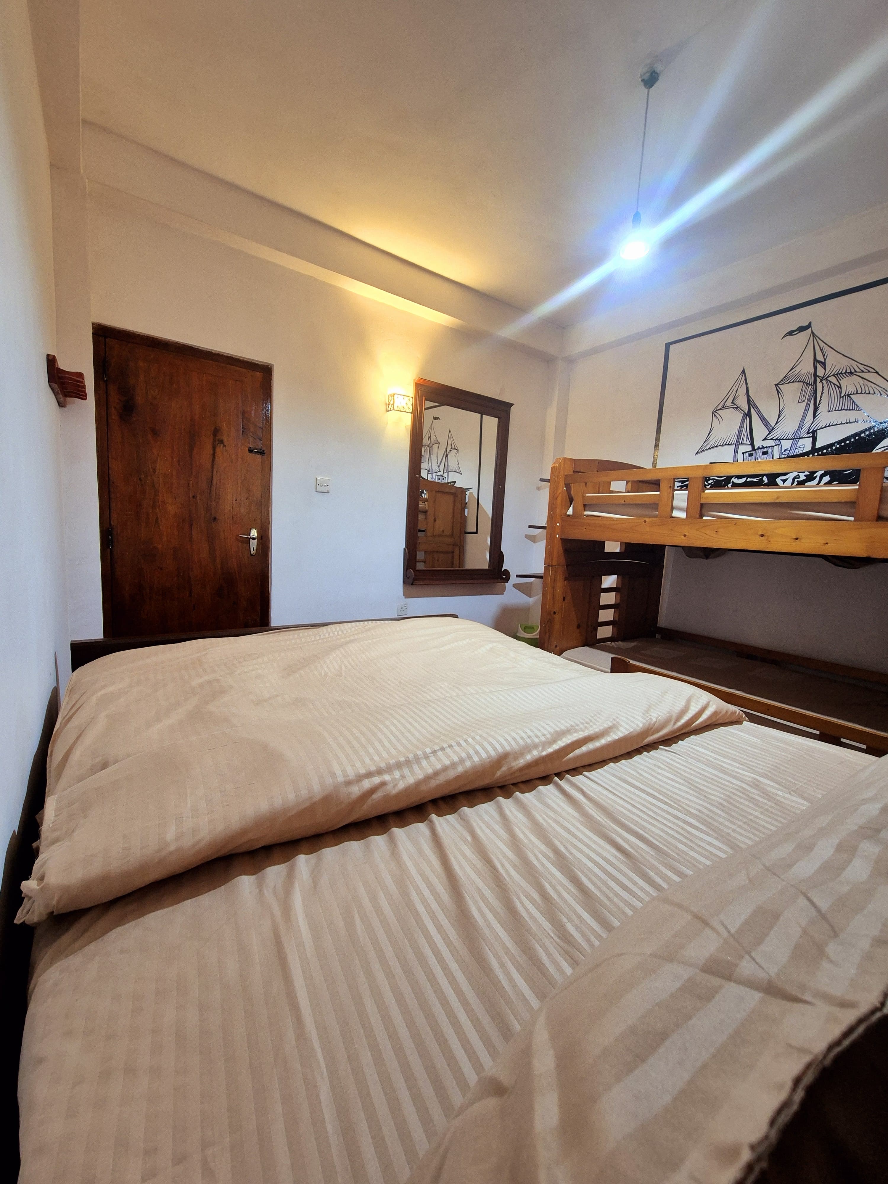 Bedroom 3 features: 1 king-size bed + bunker bed. Perfect for families or small groups. Includes hot water facilities. Tea is included, and breakfast or meals can be arranged on request.